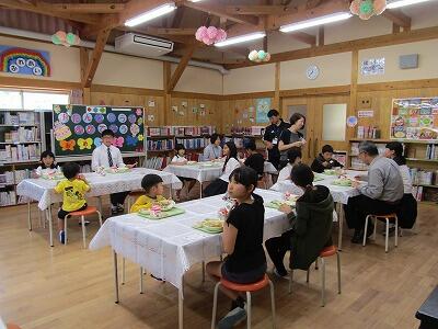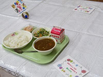 | 5月15日(水) 今日は、バースデイ給食の日でした。5月の誕生日の子どもたちと先生方が学級の枠を超えて、一緒に食事をします。また、給食のメニューにデザートが追加されます。楽しく和やかな雰囲気で食事をしていました。 |