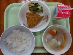 麦ごはん 牛乳 あじ青のりチーズフライ 小松菜サラダ けんちん汁