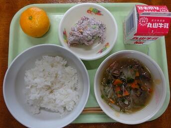 ※ 給食定番の「高野豆腐の卵とじ」です。味がよくしみていました。サラダの隠し味は「スルメ」でした。味も食感も◎です。