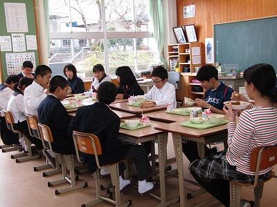 今日は交歓給食の日です。交歓給食とは、幼小中の先生が入れ替わり、別の学年で給食をいただく取り組みです。年に4回予定されています。この写真は7年生の給食の様子です。小学部の3名の先生が一緒に給食をいただいています。美郷北学園ならではの取り組みです。