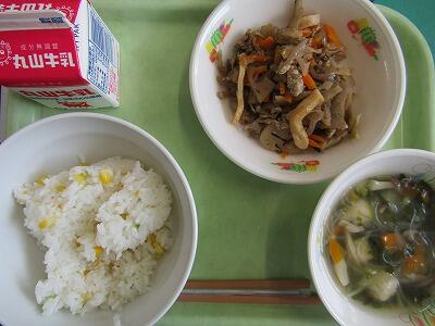 枝豆ととうもろこしのごはん、れんこんきんぴら、つくね団子スープ