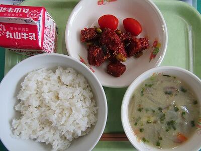 麦ごはん、かつおのケチャップがらめ、ミニトマト、さつま汁