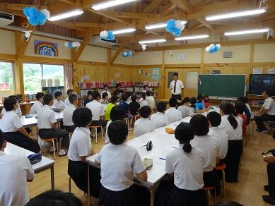 同級生のお二人は、この3月に高校を卒業して建設に関する知識と技術を学ぶために県の建設技術センターに入りました。高校時代、野球(雄大さん)とサッカー(龍一さん)に打ち込みながら、「気持ちで負けないこと」や「無駄な努力はないこと」を学んだエピソードを伝えていただきました。「将来、北郷に戻り地域のために働き、地域を活性化したい」という熱い思いを聞くことができました。