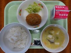 麦ごはん 牛乳 コロッケ ゆでキャベツ 豆乳汁