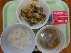※ 今日は一転して和風メニューです。煮物の中にゴロッと大きなさつまいも。その大きさと甘さにビックリしました。子どもにも食べやすい味付けです。野菜たっぷりのなめこ汁も陰の主役です。
