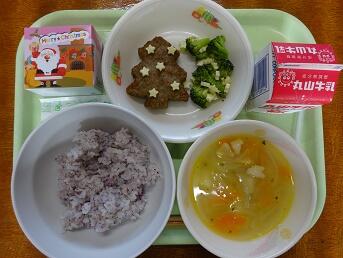 ゆかりごはん 牛乳 クリスマスツリーハンバーグ ゆでブロッコリー コーンスープ クリスマスケーキ