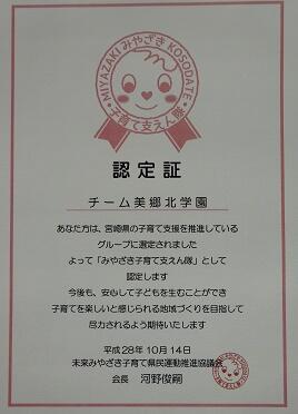 ところで、今回この学校支援ボランティアの会を立ち上げるに当たって、宮崎県こども政策課の未来みやざき子育て県民運動推進協議会(会長 河野俊嗣 宮崎県知事)が主管する「みやざき子育て支えん隊」に参加登録を申請していたところ、先日認定証が届きました。
