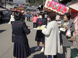 ① 参拝客への「1年生~4年生手作りのお守りしおり」や「8年生手作りの美郷町や北郷地区の案内パンフレット」の配付