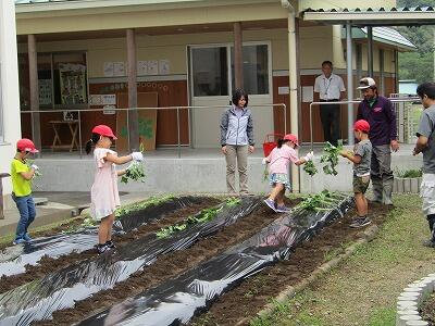| | 6月18日(火) 今日は、さつまいもの苗植えをしました。JAの方々に、ご協力いただきました。土の入れ替え、マルチ張りなど事前に準備もしていただきました。植え方の説明の後、みんな張り切って、苗を植えていました。 |