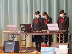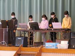 | 今日は中後期ブロック別集会が行われました。集会では、これまで音楽の授業や昼休み時間に練習を重ねてきた演奏の発表会でした。少ない人数だからこそ、一人一人の役割が重要で、演奏への責任感が増してきます。これまでの練習の成果が発揮され、一生懸命さが伝わる演奏でした。映像は、後日、きららびじょんで放送予定です。どうぞ、お楽しみにされてください。 | |