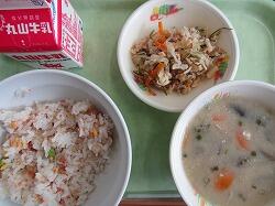 | 麦ごはん、鶏肉と里芋の含め煮、茎わかめの酢の物 |