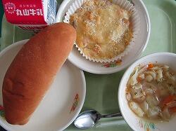 | 麦ごはん、鶏肉のレモンソース煮、野菜スープ |