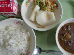 | 美郷ビーフたっぷりカレー、柚子ドレッシングサラダ、梨 (牛肉:西郷、米:美郷、梨:西郷) |