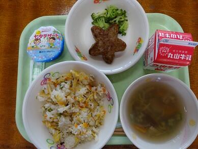 本格的なちらし寿司は、大人でも大満足の逸品。かわいい星形のハンバーグも食べるのがもったいないくらいでした。何といっても今日のスペシャルメニューは、「七夕汁」でしょう。椎茸やかまぼこなどの具材の中に、キラキラ星の形をしたものが入っていました。「オクラ」です。これもアイデアです。子どもたちもきっと気付いて楽しんだことでしょう。デザートもついて、幸せな給食時間でした。ごちそうさまでした。