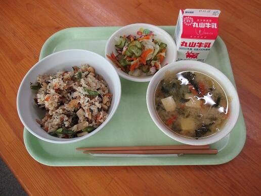 ひじきごはん 牛乳 たこときゅうりの酢の物 千切り大根の味噌汁