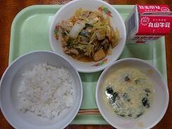 麦ごはん 牛乳 豚肉と白菜のピリ辛炒め かに玉スープ