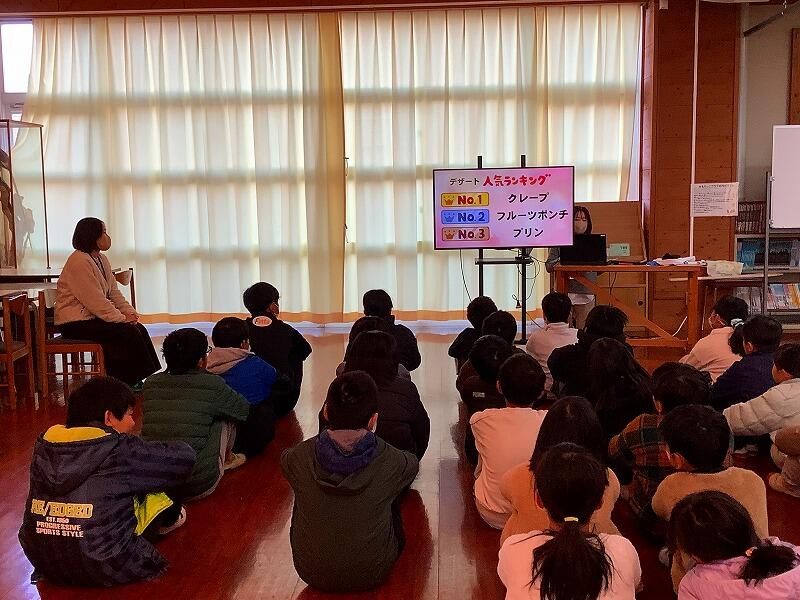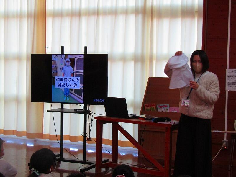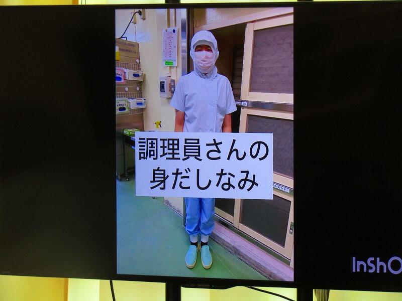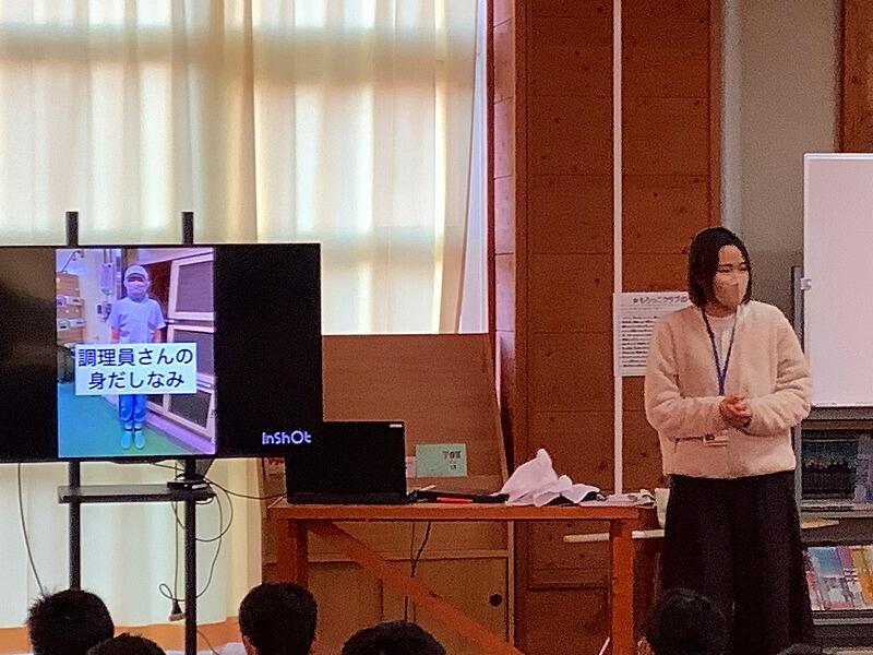 その一環として、今日の朝の活動の時間帯に「給食感謝集会」を行いました。給食保健体育委員会の子ども達が進行やクイズをしたりしながら進めました。諸塚中学校の栄養教諭の先生においでいただき、給食がどのように作られてるのかを分かりやすくお話ししていただきました。手洗いの徹底や服装などの衛生面、食材の洗浄などおいしくて安全な給食のために一生懸命取り下さっていることが分かりました。