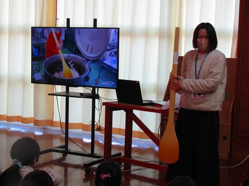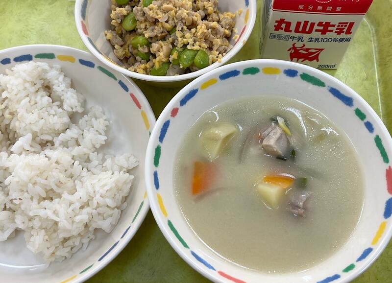 今日の献立は「飛鳥汁・三色丼・麦ご飯・牛乳」で、飛鳥汁は奈良県の飛鳥地方の郷土料理で、具だくさんのみそ汁に、牛乳を加えて作るそうです。飛鳥時代には存在していたそうです。給食は、地産地消のものはもちろん、日本各地の郷土料理、行事食、世界の料理なども献立にあり、食の文化についても触れることのできる貴重な機会となっています。