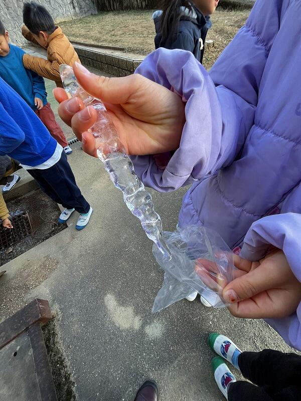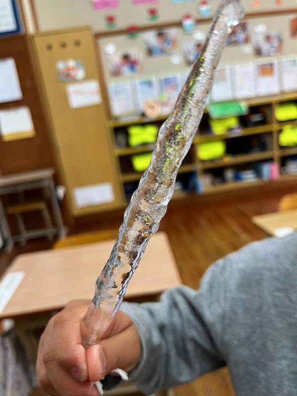 氷点下の日々が続く中、もろっこ達は、寒さに負けず元気に登校、学習、昼休みは外で元気よく遊び・・・と、学校生活を送っています。最近は、毎朝、冬の大発見を楽しむ子ども達です。「校長先生、つららです!」「こっちに氷があります!」と、寒さも何のその、冬を満喫している子ども達です。クリスタルのような透明なつららを握りしめている子ども達を見ると、霜柱をザックザックと踏んだ子どもの頃を懐かしく思い出します。大人も寒さに負けてはいられませんね!