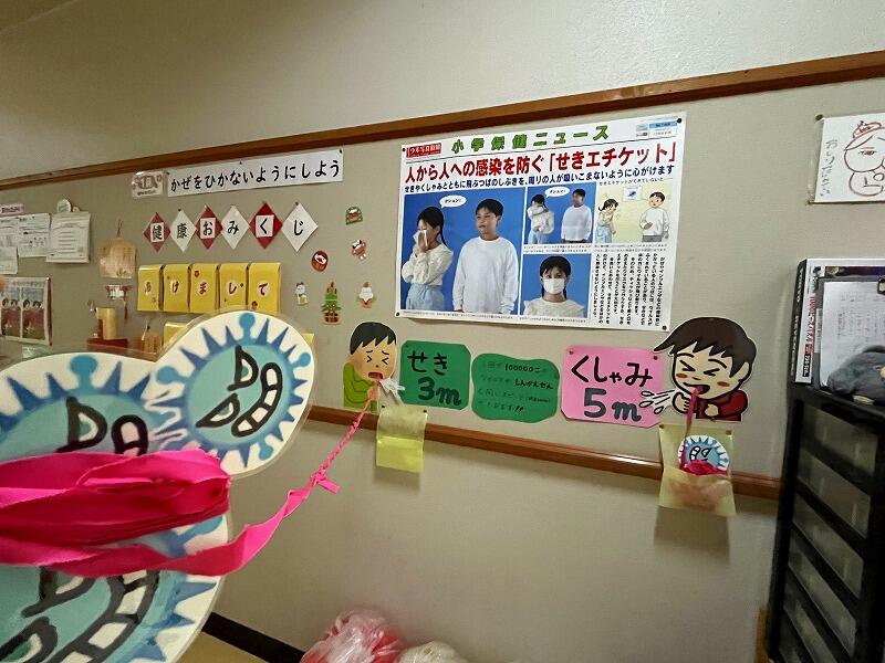 保健室前の廊下は、毎月、子ども達が保健目標を意識できるような工夫された掲示物が貼られています。