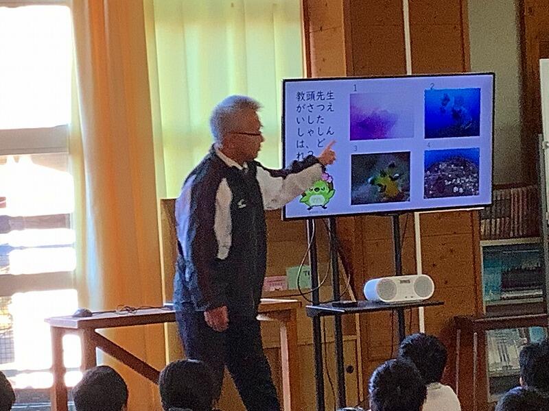 今日の全校朝会は、教頭先生のお話でした。ダイビングでの美しい海や魚、珊瑚礁の写真を紹介したり体験を話したりしながら、以前の趣味について紹介されました。美しい写真や興味深い話に子ども達も深く聞き入っていました。