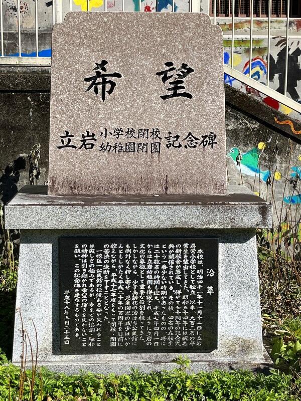 立岩小学校は、20年前の平成18年(2006年)3月31日に閉校し、同4月1日より5名の児童が諸塚小学校に編入しました。諸塚小学校からは北、約12キロメートルにあります。美しい柳原川に沿って県道50号を進むと、途中、諸塚ダムがあります。ダムの横を通り、更に柳原川に沿って進みます。以前、記事にした「立岩大明神」の少し先に立岩小学校跡があります。運動場や体育館はきれいに管理されていて、地域の方々が大事にされていることが伝わってきました。公共施設として、地域の方々が体力作りや地域の行事で活用されているそうです。
