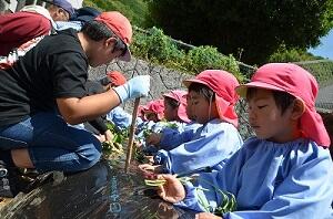 地域おこし協力隊の村上さんにおいでいただき、諸塚村の魅力について話を聞いたり体験をしたりしました。自然を生かしていることや、様々な分野で教える先生がたくさんいらっしゃること、昔ながらのものづくりがあることなど、たくさんの魅力を話してくださいました。