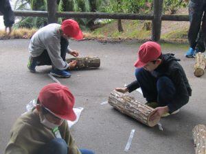 一方 3,4年生は体育館で、木の枝や新聞紙でつくった棒をつなげて「tなぐんぐん」の学習。