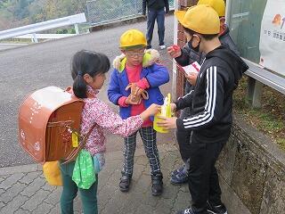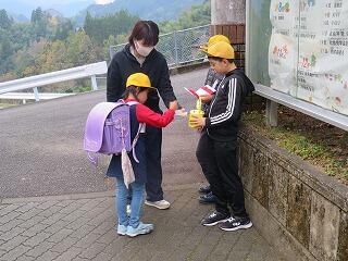 5・6年生児童が、全校児童と先生方にワッペンを配りました。