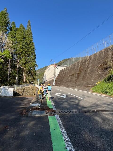 坂道、上り坂の多い諸塚小学校の通学路ですが、みんな元気に、幼稚園児も一緒に歩いています。保護者や地域の皆様も見守りや付き添っての登校、本当にありがとうございます。校門のしだれ桜が迎えてくれています。