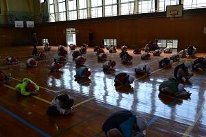 全校体育 投稿日時 : 2017/04/19 学校管理者 全校揃って初めての全校体育が行われました。6年生を先頭に整列し、「気をつけ」「休め」「回れ右」などの基本動作やラジオ体操の練習をしました。入学したばかりの1年生も、お兄さんお姉さんたちをお手本にしながら、一生懸命姿勢を正していました。体を柔らかくするためのストレッチでは「いててて・・・。」と苦しそうな声も聞こえましたが、行進の練習では「1!2!」と体育館中に大きな声が響いていました。