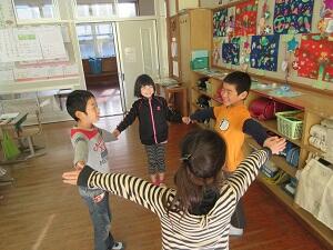 「むかいあう」とはどんなことなのかをイメージするために、4人が手をつないで長方形の形を作りました。