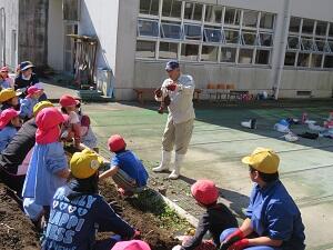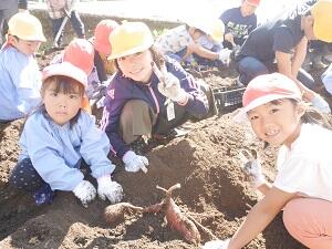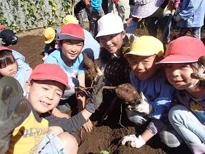 いもほり 投稿日時 : 2018/10/24 学校管理者 10月19日に、全校児童と幼稚園児で芋掘りをしました。 学校そばの、地域の方にお借りしている畑は、残念ながら動物たちに狙われてしまい、収穫ができませんでしたが、校内の畑にはたくさんの芋ができました。 中には自分の顔よりも大きな芋もあり、幼稚園児と小学生で協力して、汗びっしょりになりながら収穫しました。 この日は寿会の皆さんにお越しいただき、掘り方を教えていただきました。つるを切って下さったり、なかなか掘れない所を耕して下さったりしたおかげで、たくさんの芋を収穫することができました。 11月の収穫祭では、みんなで焼き芋にして食べる予定です。今から楽しみです。