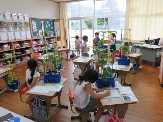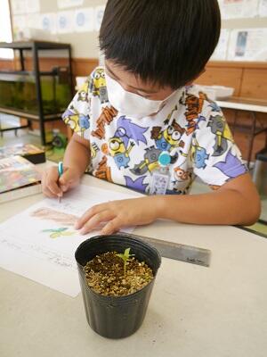 それぞれの植物で葉の形や色が違うことに気付きながら観察しています。
