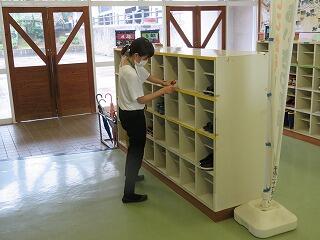 今日は、教頭と養護教諭が、児童の靴箱にテープを貼って補修していました。