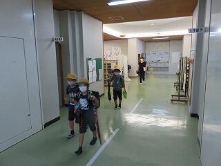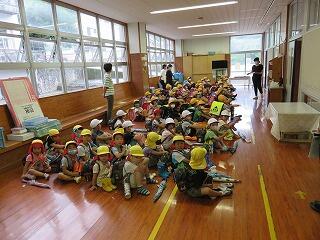 本日6校時に、幼稚園と小学校がいっしょに風水害等非常時避難訓練を実施しました。