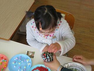 松ぼっくりに飾りを一つ一つ丁寧につけています。