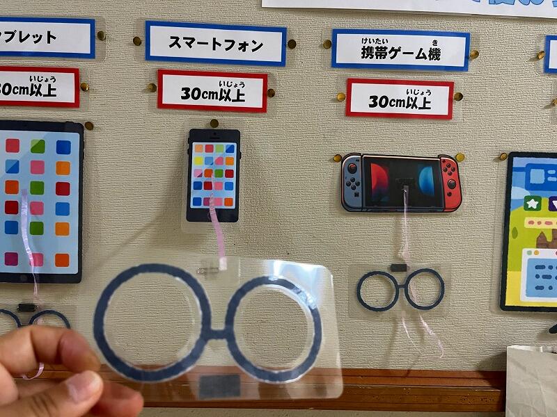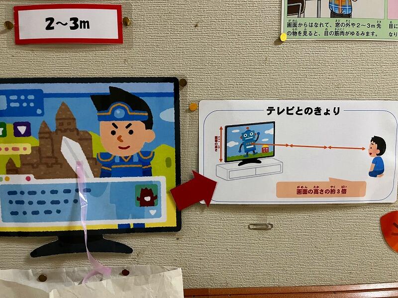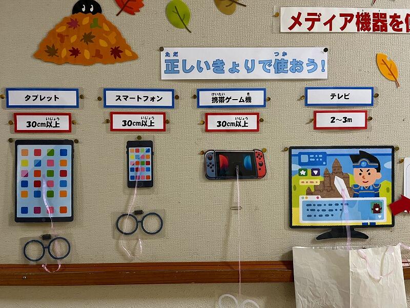 今月は目の健康について。全国的に子どもの視力低下について心配な状況が続いているというニュースを耳にします。タブレットやスマホとの距離、テレビを見るときの距離など掲示物を参考にしながら目に優しい生活を意識してほしいと思います。
