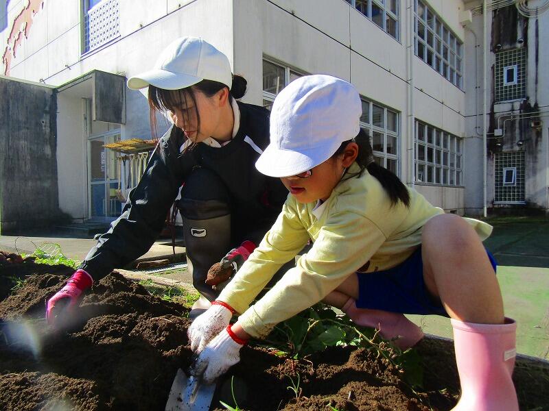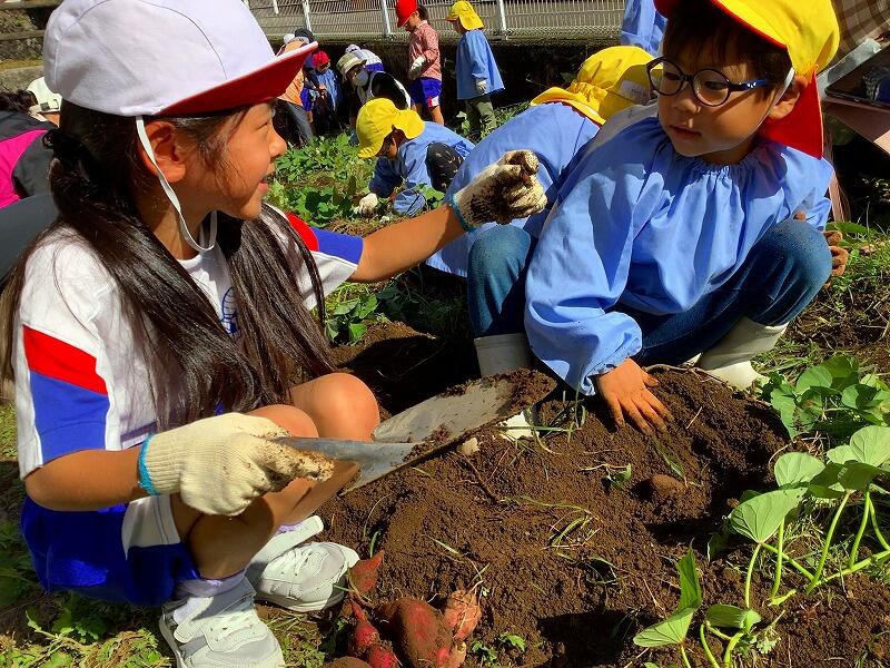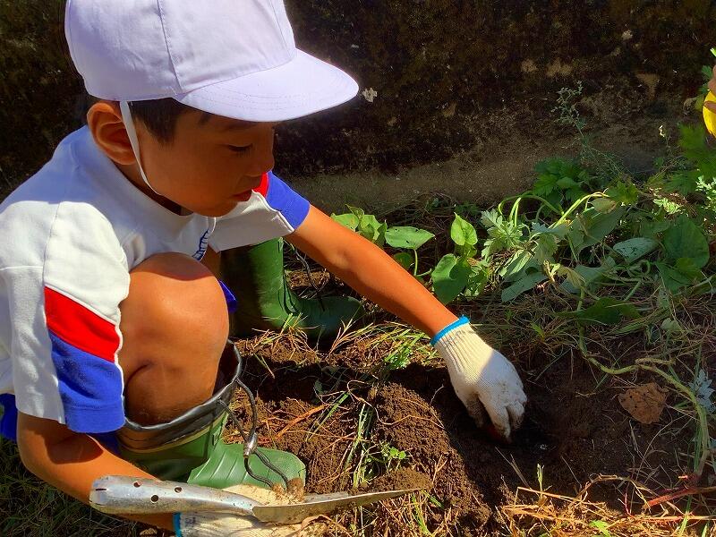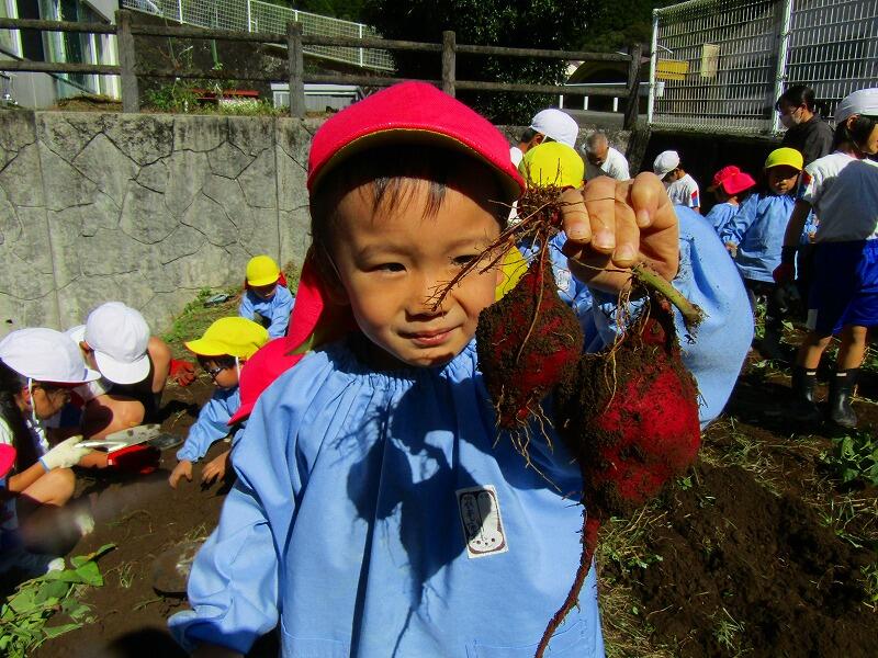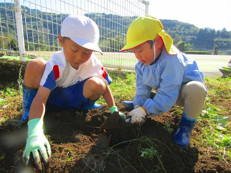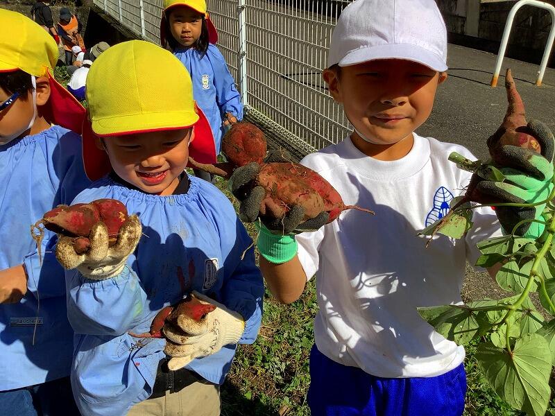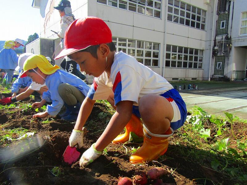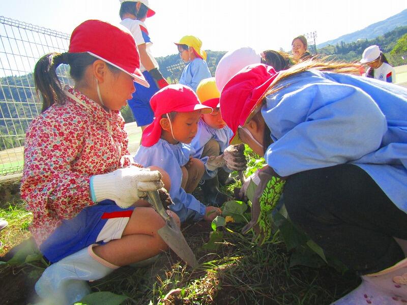 春に寿会のみなさんに教えていただきながら植えたサツマイモ。大きくなっていますように!と、いっしょうけんめい芋掘りをしました。諸塚幼稚園のお友達とも一緒に仲良く活動していました。