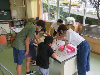 炭酸水とは?? 投稿日時 : 2020/09/18 学校管理者 6年生が「水溶液の性質」の学習をしています。今日は、炭酸水に二酸化炭素が溶けているのかどうか調べていました。炭酸水から取り出した気体と石灰水を混ぜ、白く濁ると気体が二酸化炭素だと分かります。また、その気体の中に火が着いた線香を入れ、火が消えたら二酸化炭素だということが分かります。子どもたちは、試験管をじっと見つめたり、実験結果に「オー!」と声を出したりしながら夢中で実験に取り組んでいました。子どもたちは理科の実験が大好きです。今日も楽しい理科でした。