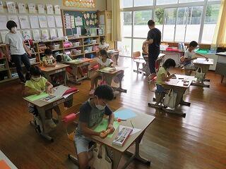 楽しい運動会に 投稿日時 : 2020/09/18 学校管理者 「運動会を盛り上げよう」「笑顔の運動会にしよう」という気持ちで、1・2年生が旗づくりに取り組んでいました。 四角の旗には、折り紙を貼ったり絵を描いたりしました。 三角の旗には、マーブリングできれいで不思議な模様を描きました。 運動会の日に、運動場で旗がはためくのをお楽しみに!!