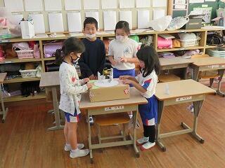 完成が楽しみ 投稿日時 : 2021/01/21 学校管理者 昨日の朝、2年生の荷物が多いので、「何かあるんですか?」と聞くと、「明日の図工で使うんです。」と教えてくれました。今朝は、たくさんの2年生が材料を持っていました。そこで、「できあがったら見せてね。」と言うと、「はいっ。」と明るく返事をしてくれました。4時間目に教室に行くと、「友達ハウス」を作っていました。階段、ベッドなどいろいろな工夫があります。大作です。完成は次回のようです。工夫がいっぱいですから、完成した作品を見るのが楽しみです。