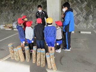 本校と七ツ山小の児童、幼稚園の年長さんで、しいたけのコマ打ちをしました。