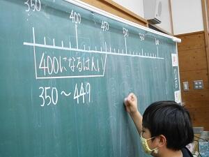 概数ってなあに!? 投稿日時 : 2020/11/02 学校管理者 4年生の算数では、「がい数とその計算」の学習をしています。これまでに、概数がおよその数であることや、四捨五入の仕方などを学びました。今日は、数直線を基にして、「百の位までの概数になる範囲」について、考えました。まずは、答えの予想を立てました。すると、「450から500」や、「490から510」など、様々な意見が出てきました。子ども達は、「百の位までの概数にするということは、十の位を四捨五入するから・・・」と、真剣に話し合いました。概数は、生活の様々な場面で使われていますので、しっかり学習していきます。