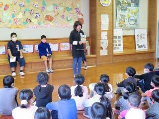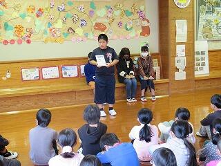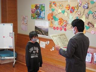 充実した全校集会 投稿日時 : 2020/11/06 学校管理者 今朝、朝の時間に全校集会を行いました。内容は、表彰とビブリオバトルです。まず、2人の児童が表彰されました。明るい選挙啓発作品コンクール 書道の部で佳作を受賞した女子と、みやざき科学技術人材育成事業「サイエンスコンクール」東臼杵地区審査で最優秀賞を受賞した男子です。この表彰を通して、2人の児童にはますます自信をもち、更なる意欲をもってほしいと思います。また、表彰を見ていた児童には、自分も何かに頑張ろうという意欲の向上につなげてほしいと思っています。 ビブリオバトルでは、放送図書運営委員会の4人が本の紹介をしました。聞いている児童に呼び掛けたり、本を広げて見せたりと工夫して紹介してくれました。堂々と、しかもはっきりとした言葉で紹介してくれたので低学年にも分かりやすかったです。とてもいいビブリオバトルでした。