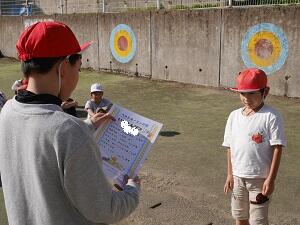 的までの距離を変えたり、的によっては得点が倍になったりと、いろいろな工夫をして楽しんでいました。