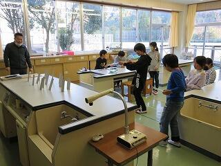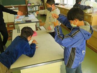4年生の理科をのぞくと、学習で使った空気鉄砲を使ってゲームをしていました。