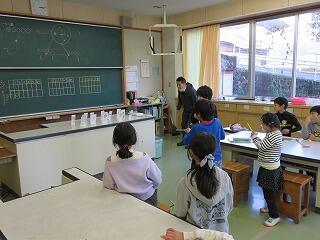 「先生、溶けました。」「なかなか溶けません。」などと言いながら、子どもたちは熱心にかき混ぜています。