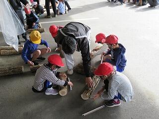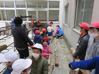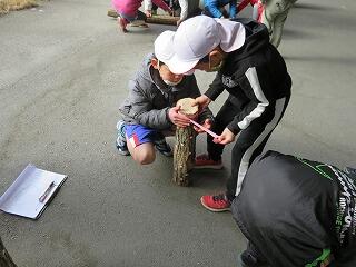 本校と七ツ山小の児童、幼稚園の年長さんで、しいたけのコマ打ちをしました。