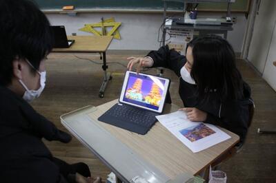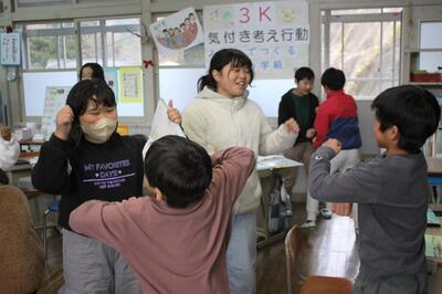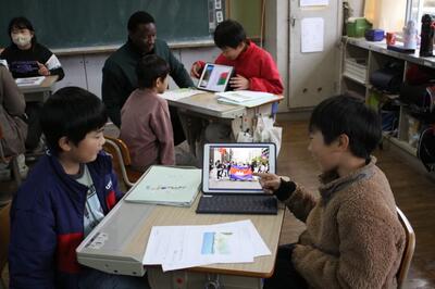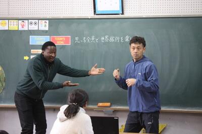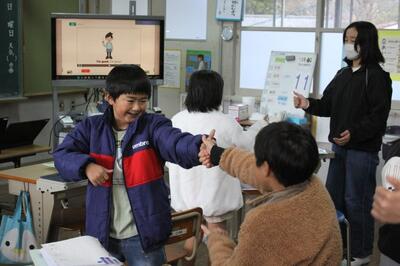 12/11(木)の3時間目に5・6年教室で「荒っ子みんなで世界旅行を楽しもう」という授業がありました。ジャンケンゲームの後、正樹先生が今日どんな学習をするのかビリー先生と一緒に説明してくださいました。